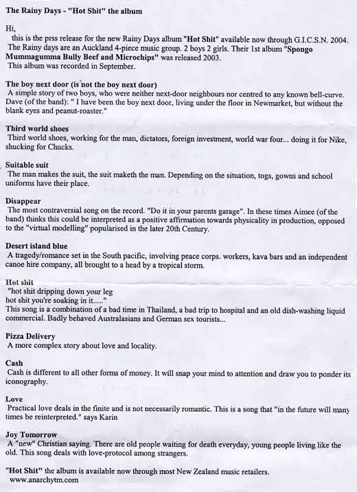 **** Veterans of the Auckland gig circuit, The Rainy Days return with their sophomore offering, Hot Shit. While 2003's Spongo... was at times exciting if a little rambling, Hot Shit is a far more polished effort and all the better for it. The guitars are tighter and cleaner, and are bolstered by a funky horn section. This fattened, more satisfying sound works to great effect on opener 'The Boy Next Door'. Meanwhile, exquisite ballad 'Desert Island Blue' fuses beautifully ragged piano with mournful strings*. A real gem. Their live show comes highly recommended too.